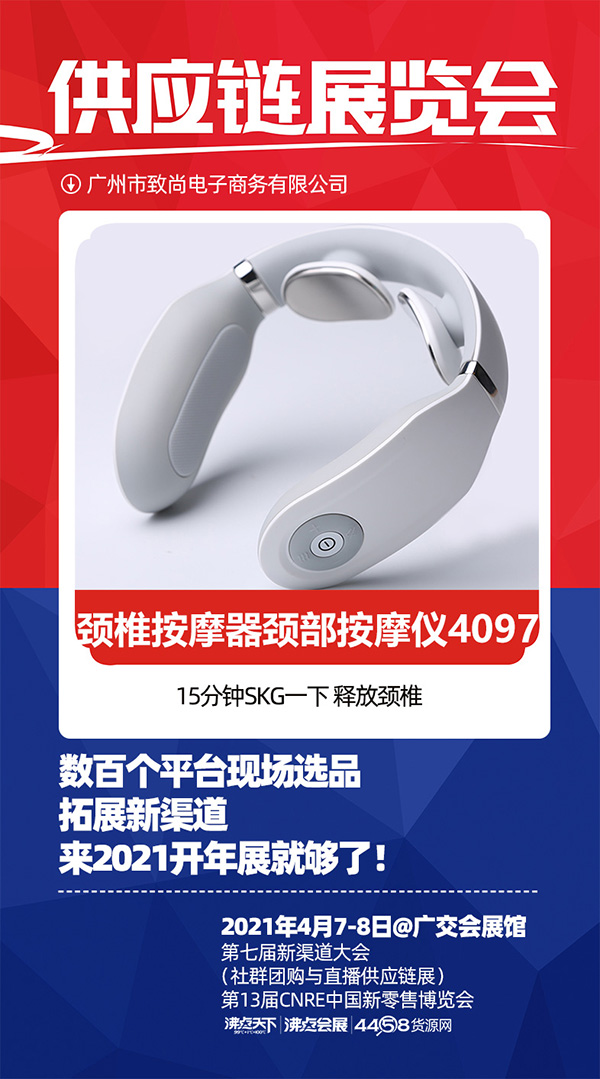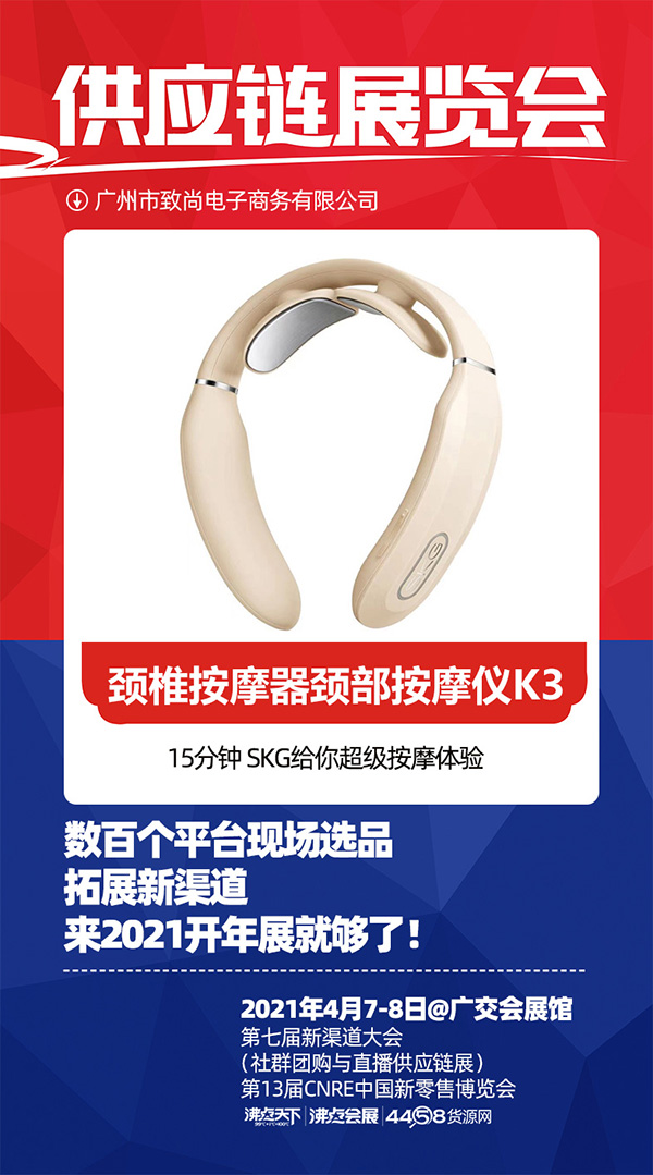 由沸点天下、沸点会展、4458货源网联合举办的“2021第七届新渠道大会(社群与直播供应链展)、第13届CNRE新零售博览会”将于2021年4月7日在广州举办,深圳致尚电子商务有限公司携SKG系列产品受邀参展!