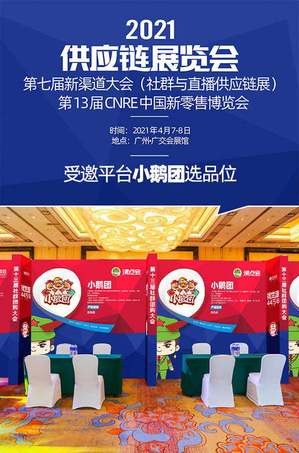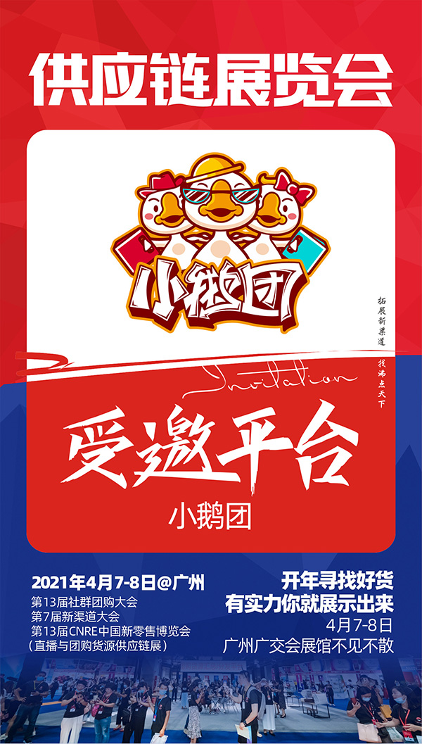 分享型社交新零售平台小鹅团受邀参加的2021供应链展览会于4月7-8日,在广州广交会馆B区举办,本次展会以【新渠道,新机遇,新增长】为主题,旨在让更供货商快速对接新渠道,获得更增长。