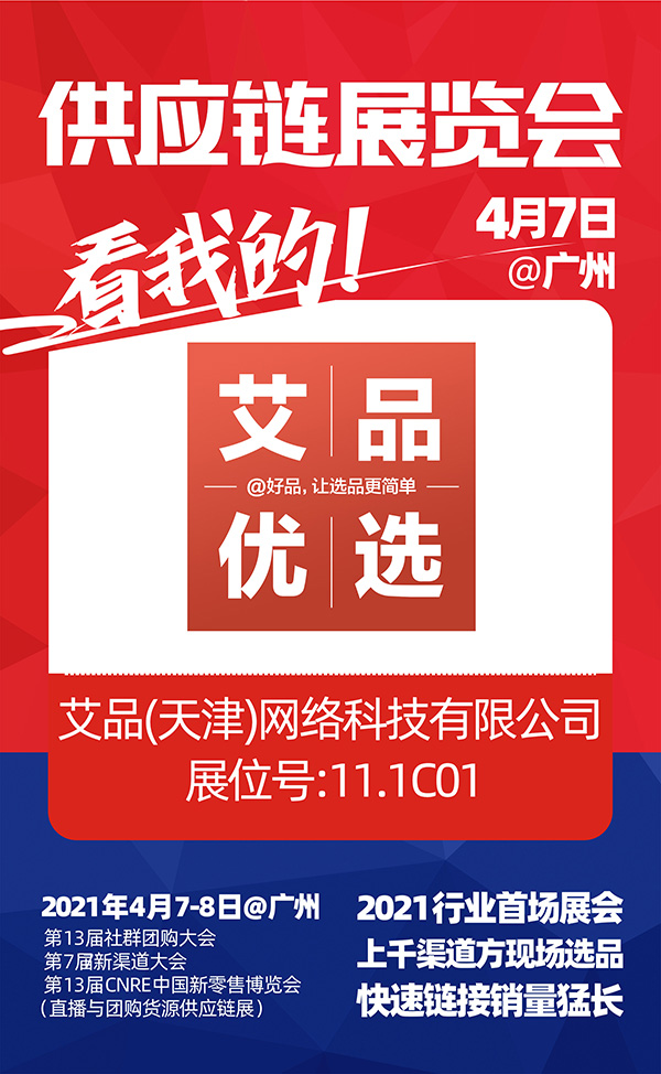 2021年4月7-8号,2021社群团购供应链开年展,艾品(天津)网络科技有限公司与你相约广州广交会馆,展位号:11.1C01,不见不散。