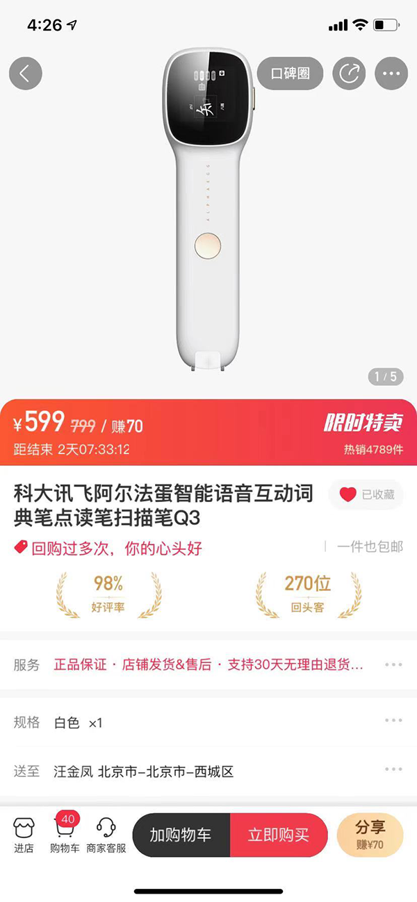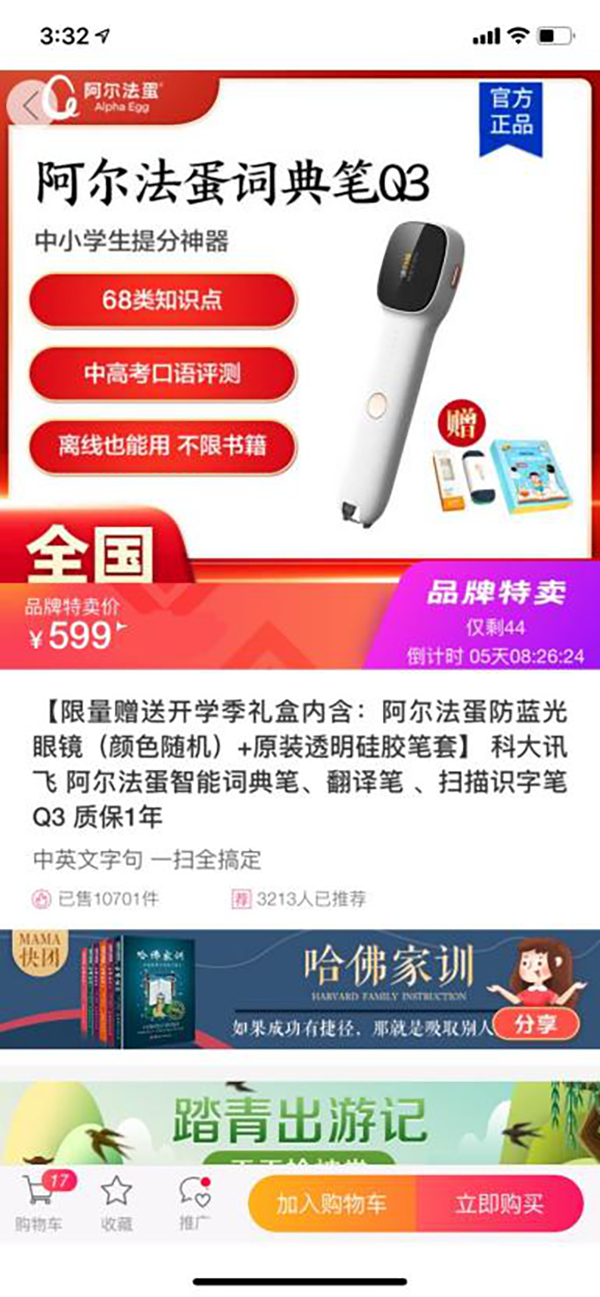 艾品(天津)网络科技有限公司主打讯飞阿尔法蛋词典笔Q3,在大V店、洋葱、云集、凯叔、卢司玲、斑马易团、猩球掌柜等平台,及其它渠道共计销售8万多支。