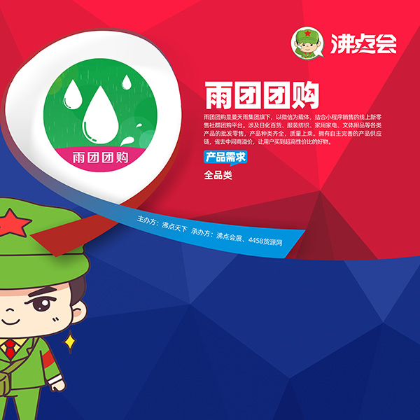 雨团团购入驻平台展位,欢迎供应商朋友们带样品洽谈合作。同时本届大会主要分为春季爆品展区、零食食品区、服装鞋包区、家居百货区、孕婴童产品区、小家电展区、跨境商品展区六大展区,设置1000个展位,预计有5000款产品现场展示对接。