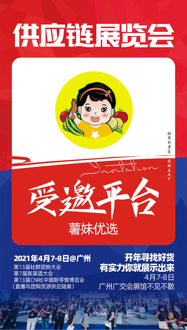 2021供应链展览会,现场采购选品,嘉宾分享干货,现场对接,学习交流,都能满足您的需求,薯妹优选诚邀供货商朋友带着产品来展位洽谈合作。