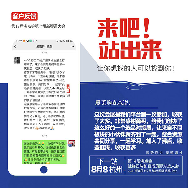 这次会展是我们平台第一次参加,收获了太多。非常感谢勇哥,给我们创办了这么好的一个选品对接展,让来自不同板块的小伙伴聚齐到了一起,整合资源,共同分享,一起学习。加入了沸点,收益匪浅,收获甚多。