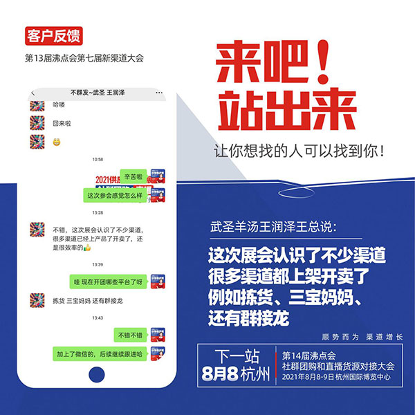 由沸点会展主办,4458货源网、万团会协办的“2021第14届沸点会、社群团购与直播货源供应链展览会、第14届CNRE新零售博览会”【简称:供应链展】将定于2021年8月8日-9日在杭州国际博览中心举办,千万别错过!!