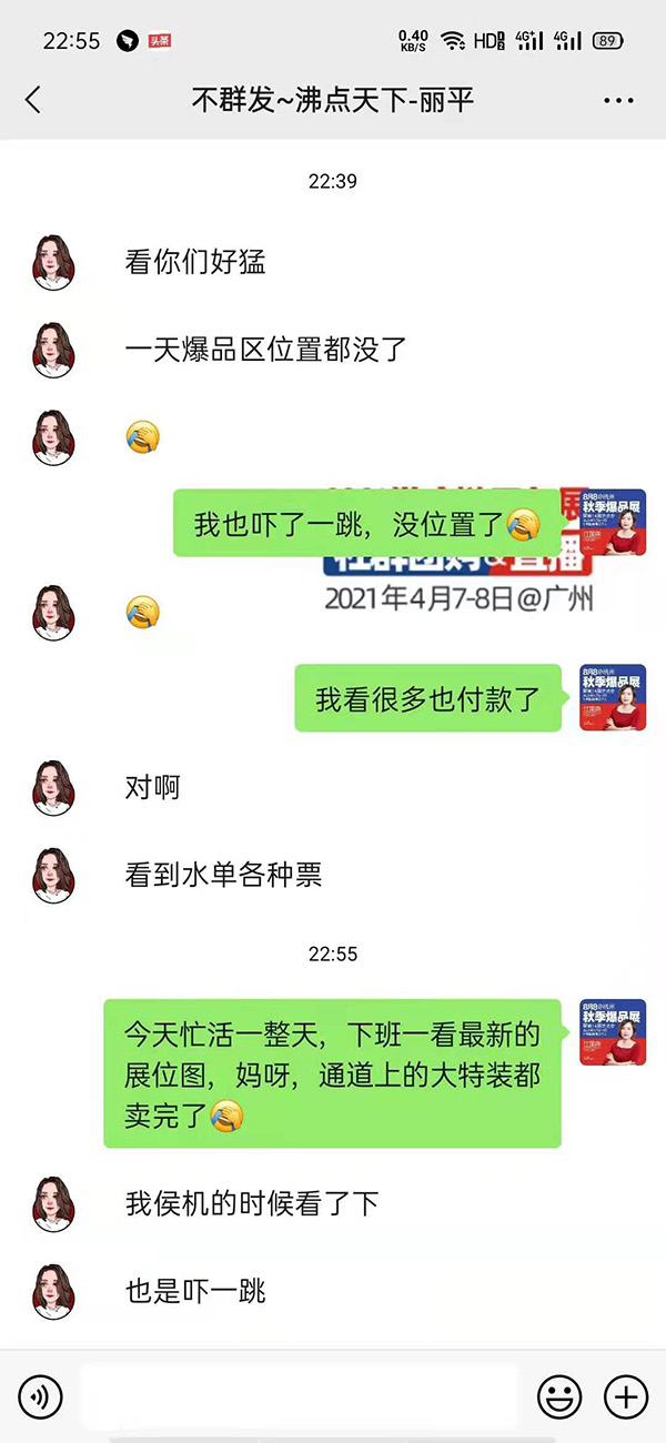 还有同事在群里讨论:为什么这次杭州展会定特装的客户特别多呀?