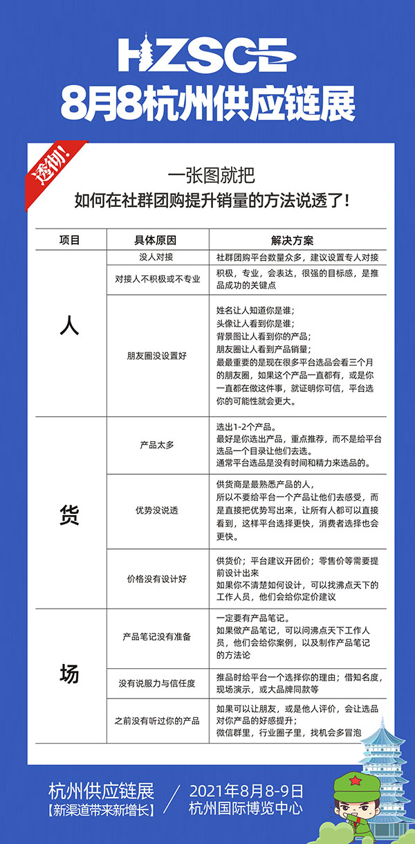 8月8号杭州国际博览中心,【2021杭州供应链展】几百个平台都会在现场来选品,如果你想拓展社群团购渠道,带着你的产品,来到的现场就好了。4大选品环节,可直接链接到平台,面对面推荐产品!