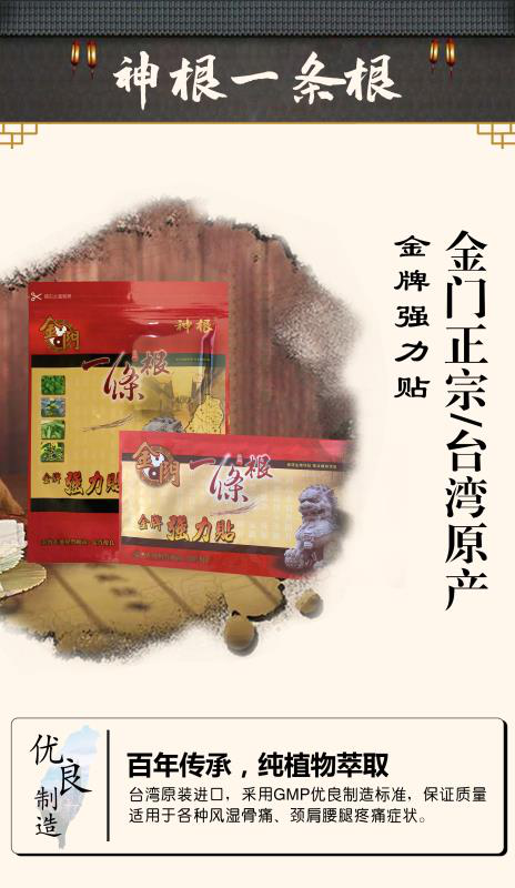 主要卖点:如强力贴布:用金门特有植物一条根为原料,渗透性强5分钟见效、纯天然植物萃取无任何副作用。胶体为日本产天然橡胶,贴上舒适度好没有异物感适合男女老少使用,不过敏,无纺布伸展透气有弹性可贴于身体任何部位。产品气味芳香给人愉悦感,各种酸痛不适最佳选择!!