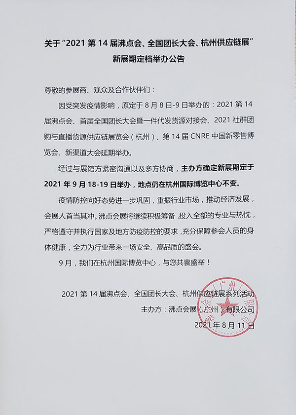因受突发疫情影响,原定于8月8日-9日举办的2021第14届沸点会、首届全国团长大会暨一件代发货源对接会、2021社群团购与直播货源供应链展览会(杭州)、第14届CNRE中国新零售博览会、新渠道大会延期举办。