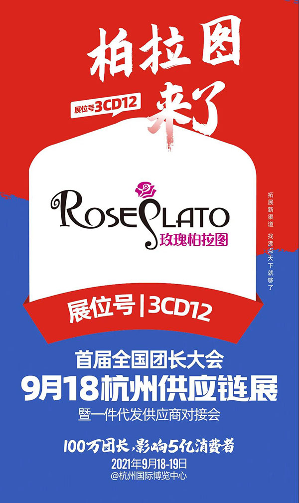 9月18杭州一件代供应商对接会是沸点会展主办,4458和万团会联合承办,也叫第14届沸点会,是私域领域最重要的展会,每次活动都吸引行业行业内及丰关领域数万观众参观学习,资源链接并产生合作。届时,普宁市柏拉图贸易有限公司旗下品牌玫瑰柏拉图与你相约3CD12展位。