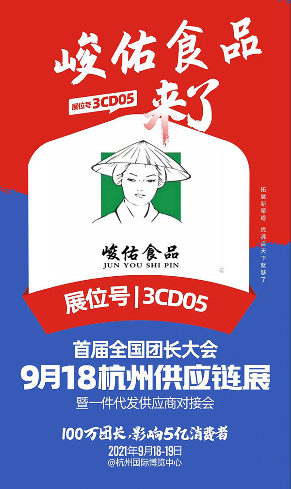 9月18杭州一件代供应商对接会是沸点会展主办,4458和万团会联合承办,也叫第14届沸点会,是私域领域最重要的展会,每次活动都吸引行业行业内及丰关领域数万观众参观学习,资源链接并产生合作。届时,峻佑食品受邀参展,展位号:3CD05。