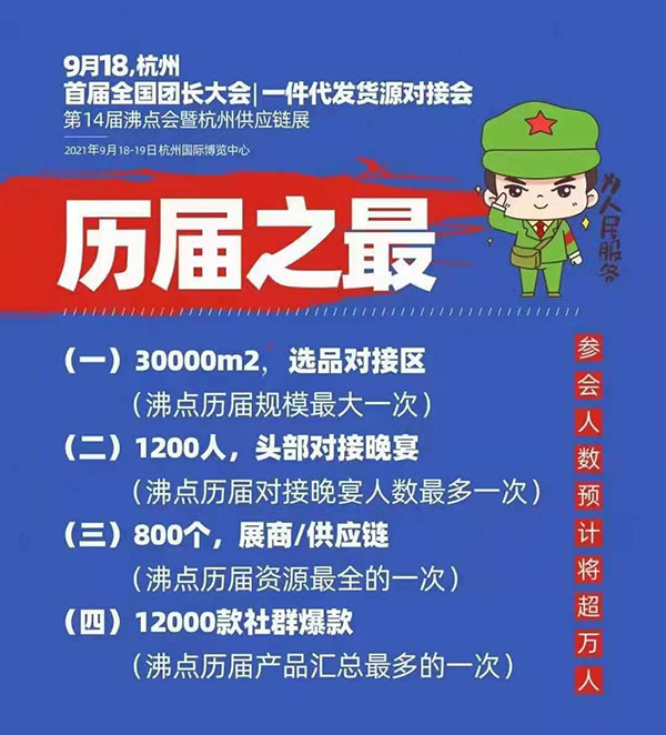 三年的社群与团购的发展,成长出一大批优秀的社群团购平台和团长!2021年9月18日,由沸点天下创办,沸点会展主办的首届全国团长大会一件代发货源供应商对接会,将在杭州国际博览中心举办。沸点将以三年的行业资源,举办了这场历届活动的“四大之最”:1、沸点历届规模最大(30000平方的选品对接区)2、沸点历届对接晚宴人数最多(1200人头部货源方和平台团长)3、沸点历届展商最多(800+展商/供应链)4、沸点历届产品汇总最多(将超过10000款社群爆款展示)参会预计将超过万人。