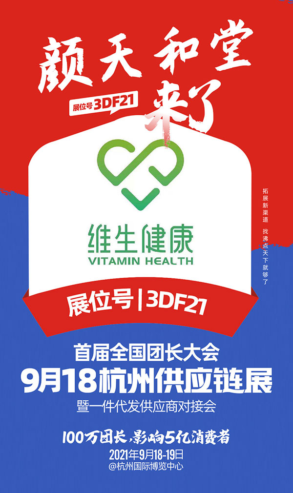 2021年9月18-19日,私域赛道社群团购领域的首届一件代发供应链对接大会,将在杭州国际博览中心举办。本次大会规模较大,设立了三个馆的选品区,分为爆品馆、轻奢馆和好货馆。产品类别涉及:吃(食品)穿(服装)用(百货)美(化妆品)四大品类。届时,轻食供应链——亳州市维生健康产业有限公司将受邀参展!