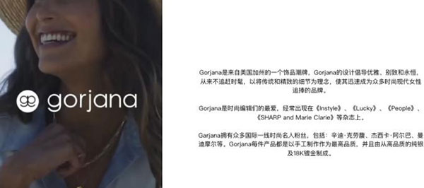 Garjana拥有众多国际一线时尚名人粉丝,包括:辛迪·克劳馥、杰西卡·阿尔巴、曼迪摩尔等。Gorjana每件产品都是以手工制作作为最高品质,并且由从高品质的有色金属及18K镀金制成。