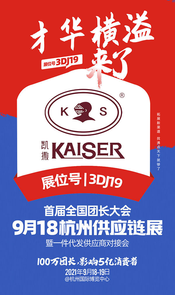 2021年9月18日,由沸点天下发起,沸点会展主办的第14届沸点会暨社群团购与直播选品会在杭州国际博览中心举办!同期举办首届全国团购团长大会一件代发货源供应链对接会,来自全国的社群团购平台、快团团、群接龙明星团长受邀参加!中国高级服装品牌——桐乡市才华横溢有限公司品牌凯撒(KAISER)受邀即将参加此次展会!