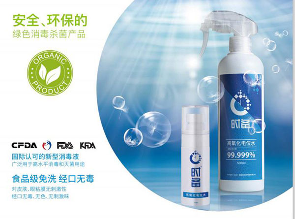 时备高氧化电位水是纯电解生成,无化学品添加合成,无污染,无残留。入眼无刺激、经口无毒、对皮肤无刺激、作用后还原成为水、不燃不爆、无刺激性,无腐蚀性,是新一代绿色环保高水平消毒液。