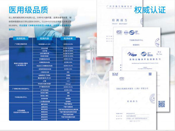 高氧化电位水利用纯电解方式生成,是目前世界最稳定、最领先的电解分离技术。在中国境内取得了全套产品消毒检测认证并正式备案成为中国正规消毒产品。经上海权威检测机关检测认证,高氧化电位水对大肠杆菌,金黄色葡萄球菌,铜绿假单胞菌,白色念珠菌杀灭率达到99.999%以上,符合国家《消毒技术和规范》的要求,达到高水平消毒和灭菌用途。
