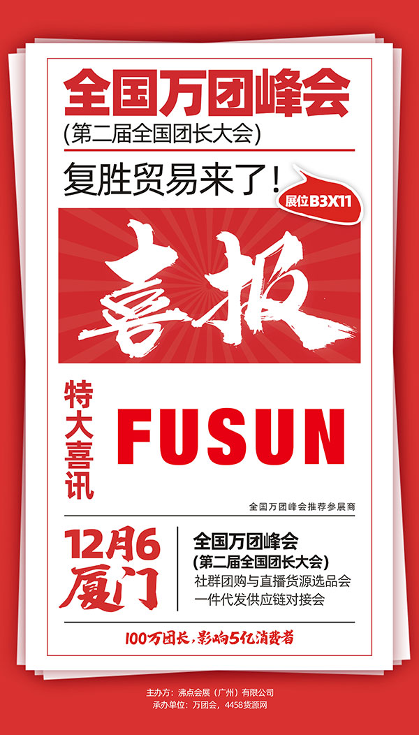 厦门全国万人团长大会,规格高、规模大、资讯新、通路全的专业特色,吸引了众多王牌企业参展。复胜贸易希望通过此次活动寻求更多私域流量团购、社交电商、私域电商、寻求各种社群团购、直播平台、福利平台、供应链合作。复胜贸易诚挚欢迎更多优质的合作伙伴于12月6-7日前往厦门国际会展中心B3X11观临指导,共同发展,合作双赢。