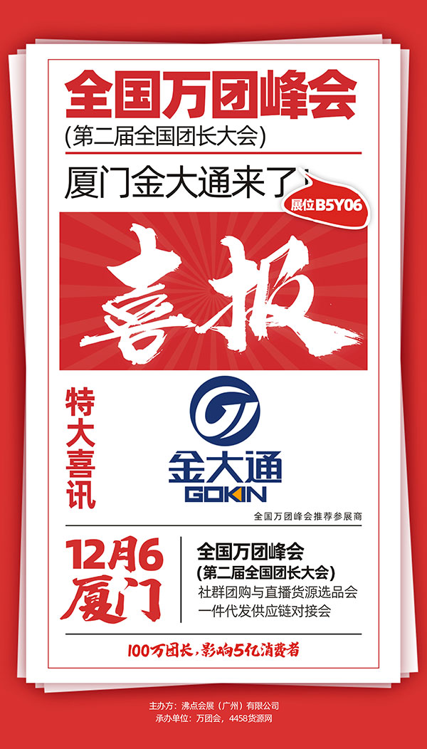 厦门全国万人团长大会定于12月6-7日在福建厦门举办,团购行业的TOP100及优秀的平台和团长都将受邀参加并颁奖,更有母婴、食品、零食、服饰、百货、家居、化妆品、小家电年度TOP榜单发布。届时,厦门金大通供应链有限公司将受邀参展本次活动。