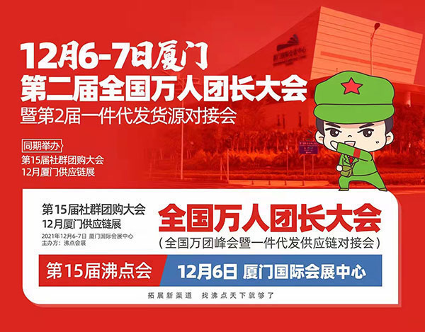 12月6号厦门第2届全国万人团长大会暨第15届社群团购大会,展位面积20000平,展商数量500+,新品爆品10000+,渠道方1000+,行业观众10000+,欢迎想要拓展新渠道,想要链接社群的酒类品牌,酒类生产企业,或酒类经销前,前来链接渠道,实现销售增长。