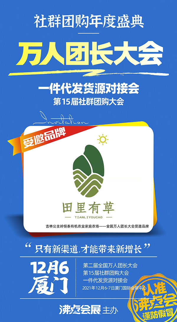 厦门全国万人团长大会定于12月6-7日在福建厦门举办,团购行业的TOP100及优秀的平台和团长都将受邀参加并颁奖,更有母婴、食品、零食、服饰、百货、家居、化妆品、小家电年度TOP榜单发布。届时,吉林公主岭恒泰有机农业家庭农场旗下品牌田里有草将受邀参展本次活动。