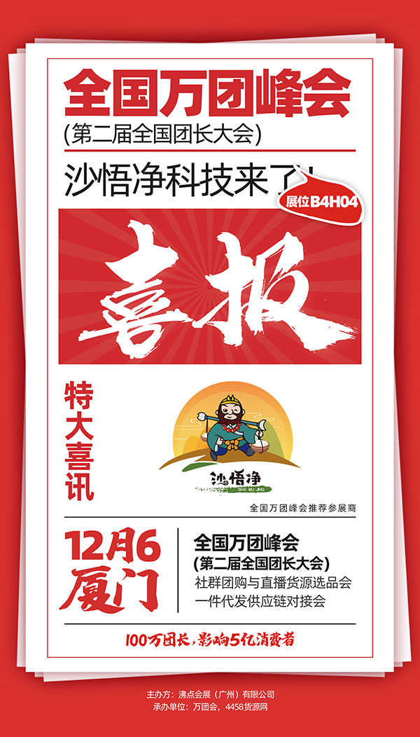 “沙悟净”品牌旨在通过沸点活动扩大产品知名度,诚招全国加盟代理商,寻求各种线上线下合作。12月6—7日,“沙悟净”品牌与您相约厦门国际会展中心!锁定展位号:B4H04,期待你的到来!