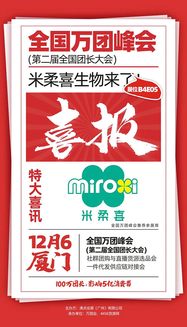 2021年12月6-7日,厦门全国万人团长大会将于厦门国际会展中心盛大开幕。此次盛会备受瞩目,已有数百家品牌和团队携大批新产品、新技术、新服务参展厦门全国万人团长!展会期间,杭州米柔喜生物科技有限公司将携旗下品牌米柔喜展出亮相。