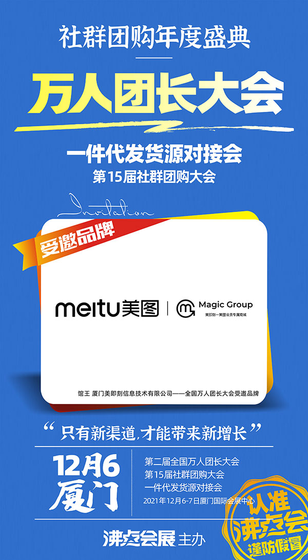 12月6号,厦门全国万人团长大会,规格高、规模大、资讯新、通路全,吸引了众多王牌企业参展。活动由沸点天下创办,由沸点会展主办,社群团购平台,各大工具平台头部团长聚集,是社群渠道的年度盛典。届时,馆王——美即刻-美图社交电商平台,也将受邀参展。