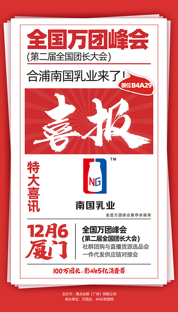 12月6号厦门第2届全国万人团长大会暨第15届社群团购大会,展位面积20000平,展商数量500+,新品爆品10000+,渠道方1000+,行业观众10000+,是社群渠道的年度盛典。如此盛典,老少皆宜的乳制品企业——南国乳业受邀参展厦门全国万人团长大会,届时欢迎您莅临B4A29展位参加!