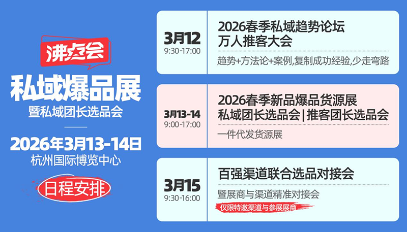 据悉,本届大会创新性地将会展服务延伸至四天。3月12日将举办1500-2000人规模的私域趋势论坛,邀请实战派嘉宾分享干货;3月13-14日为主展期,开展选品对接活动;3月15日增设闭门推品会,为展商与头部渠道提供深度对接机会。