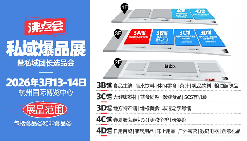 据主办方沸点会展(广州)有限公司介绍,本届展会启用杭州国际博览中心三楼和四楼全部6个展厅,总活动面积达50000平方米。展品范围涵盖食品饮料、美妆个护、家居百货、大健康滋补、服装饰品等全品类私域热销产品,预计现场展示新品数量将超过10000款。