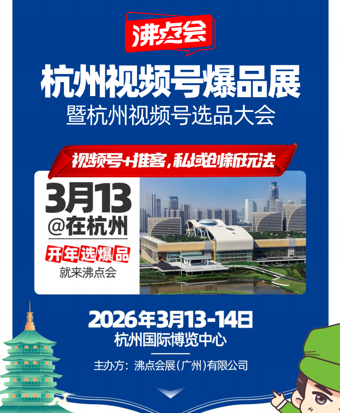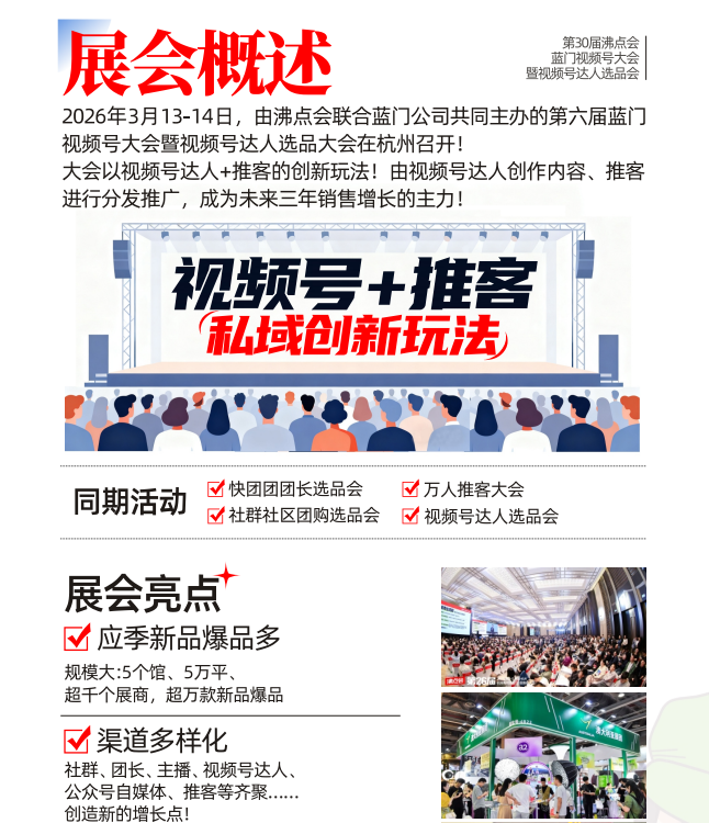 杭州视频号爆品展暨杭州视频号选品大会是每年3月13沸点会在杭州举办的私域开年展的一部分,跟蓝门视频号大会共同主办。主要帮助视频号达人对接货源,帮助视频号达人选品。同时,也是推客视频号达人与推客进行对接的桥梁,创建了一个新的模式玩法!
