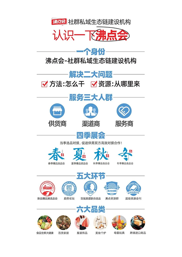截至目前,沸点会已成功举办多届全国团长大会、私域团长大会、推客大会、视频号选品会,形成会+展+群+对接会的全链路服务体系,覆盖全国98%私域头部渠道,是供货商新品起量、渠道方找爆品的首选平台。