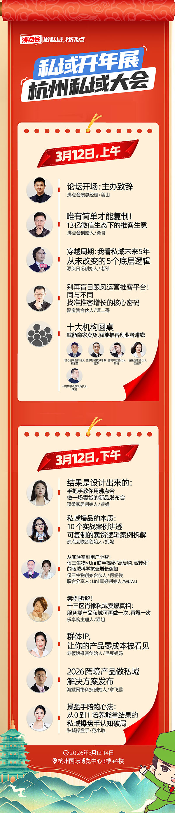 3月12日,沸点会论坛精准聚焦私域从业者的核心痛点,以问题为导向,落地为核心,把私域全链路10大高频难题,拆解成11套可直接套用的解决方案。没有空洞的理论宣讲,只有问题对应解法、解法落地到动作的实战干货,让你一听就懂、拿来就用,彻底打破私域增长瓶颈。