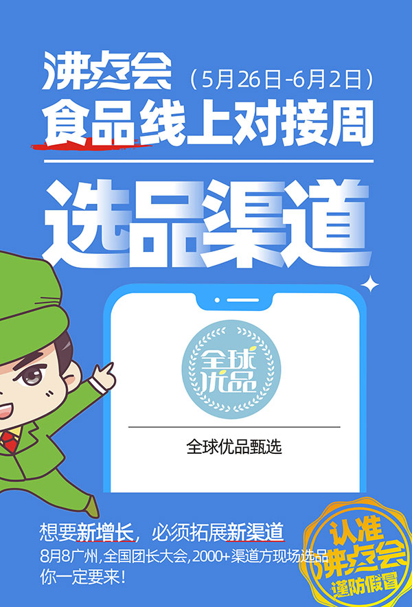 2022年5月26日-6月1日,为助力食品企业精准对接社群渠道资源,把握社群食品品类的销售增长机遇,沸点会展特打造【沸点会.食品对接专场】,目前,全球优品甄选确认出席沸点会·食品线上对接周。