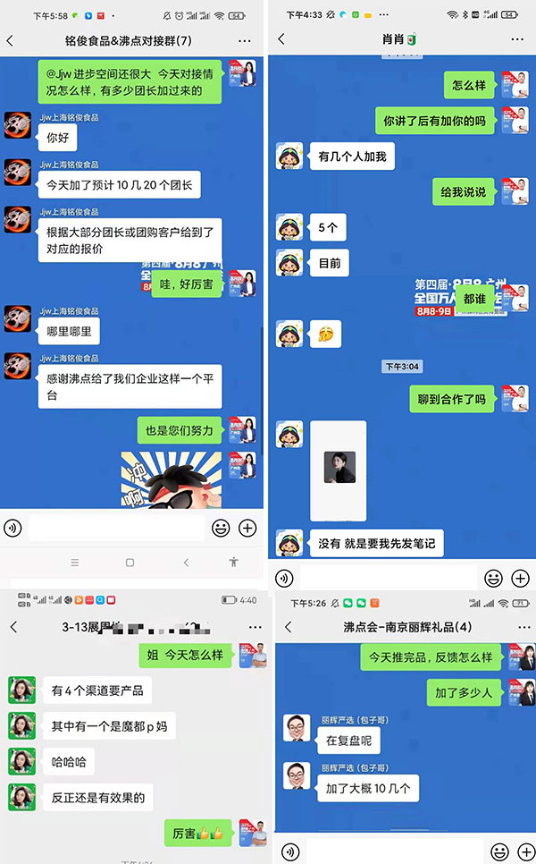 由沸点会展举办的沸点会.食品线上周第2场,预制冷冻食品专场,今天在专场对接群举办。活动刚刚结束,就有展商反馈:已经有4个渠道方加我了,其中一个是魔都P妈!线上对接还是有效果的!