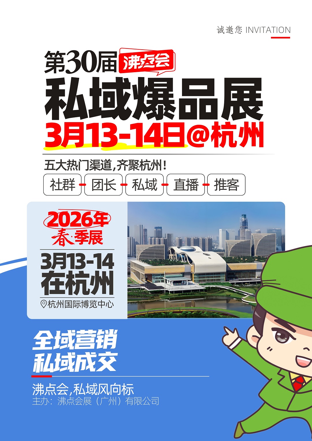 新闻导读2026私域开年大展,第30届沸点会暨杭州私域爆品展,官宣定档2026年3月13-14日,将在杭州国际博览中心举办。