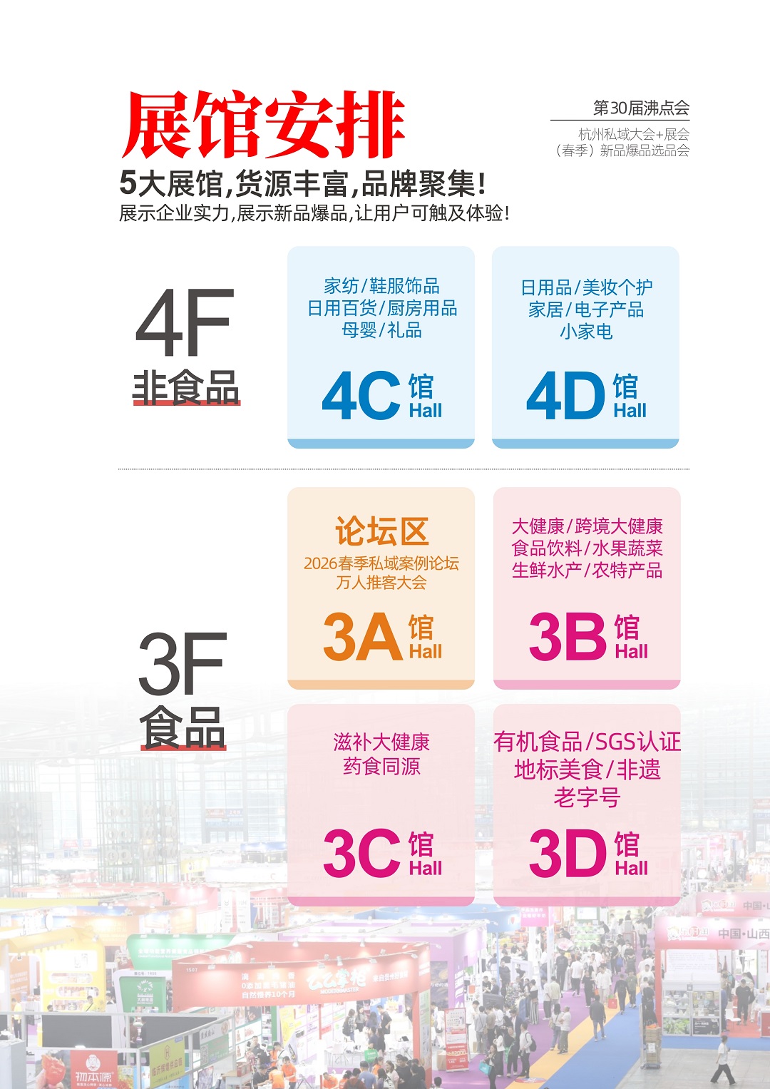 此次杭州沸点会,将启用杭州国际博览中心6大展馆:3A/3B/3C/3D/4C/4D,总面积超5万平米,1000+家优质参展商,10000+新品爆品展出,98%私域头部渠道现场选品。