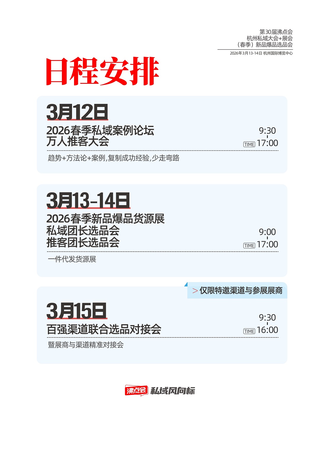 3月13-14日:2026春季新品爆品货源展;1000+供货商同台展示产品,98%私域头部渠道现场选品。