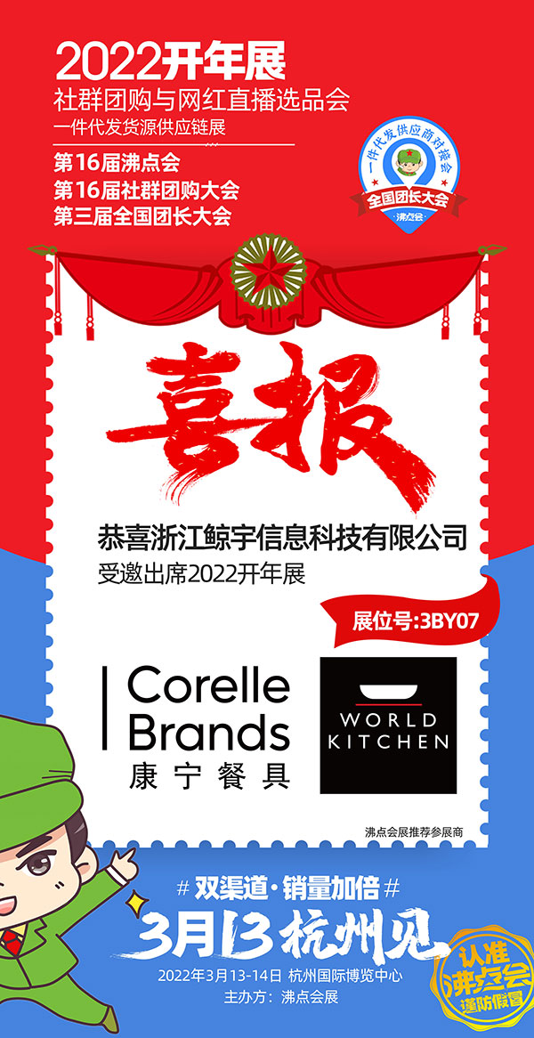 2022年3月13-14日,2022开年展在杭州国际博览中心隆重举办,聚焦双渠道、销量增长加倍。本次活动由沸点天下创办,由沸点会展主办,一次可以链接上美食、美妆、母婴、零食、服装、百货、小家电、特产生鲜等各类适合社群团购和直播电商的一件代发一手货源。如此盛典,浙江鲸宇信息科技有限公司受邀参展,届时欢迎您莅临3BY07展位参加!
