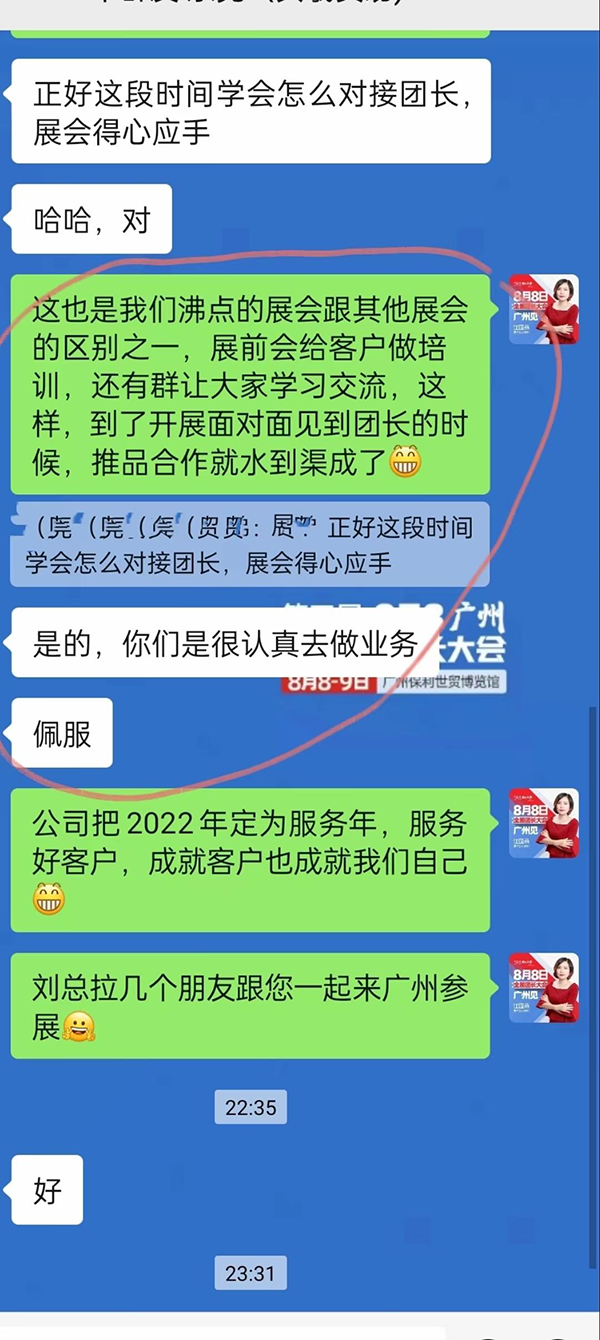 下面是一个企业在参加完沸点会展针对8月8广州全国团长大会后,给沸点会展销售总监江国燕的反馈: