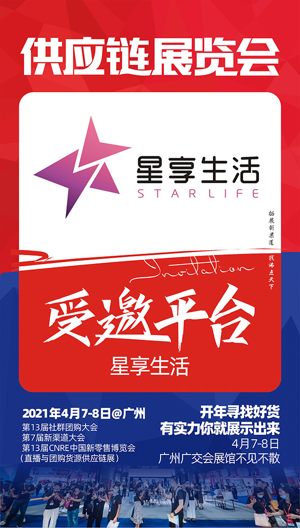 2021供应链展览会于4月7-8日,在广州广交会馆B区举办,此次大会由沸点天下、沸点会展、4458货源网联合举办。分为春季爆品展区、零食食品区、服装鞋包区、家居百货区、孕婴童产品区、小家电展区、跨境商品展区六大展区,设置1000个展位,预计有5000款产品现场展示对接。星享生活入驻平台选品对接会,诚邀供货商朋友洽谈合作。