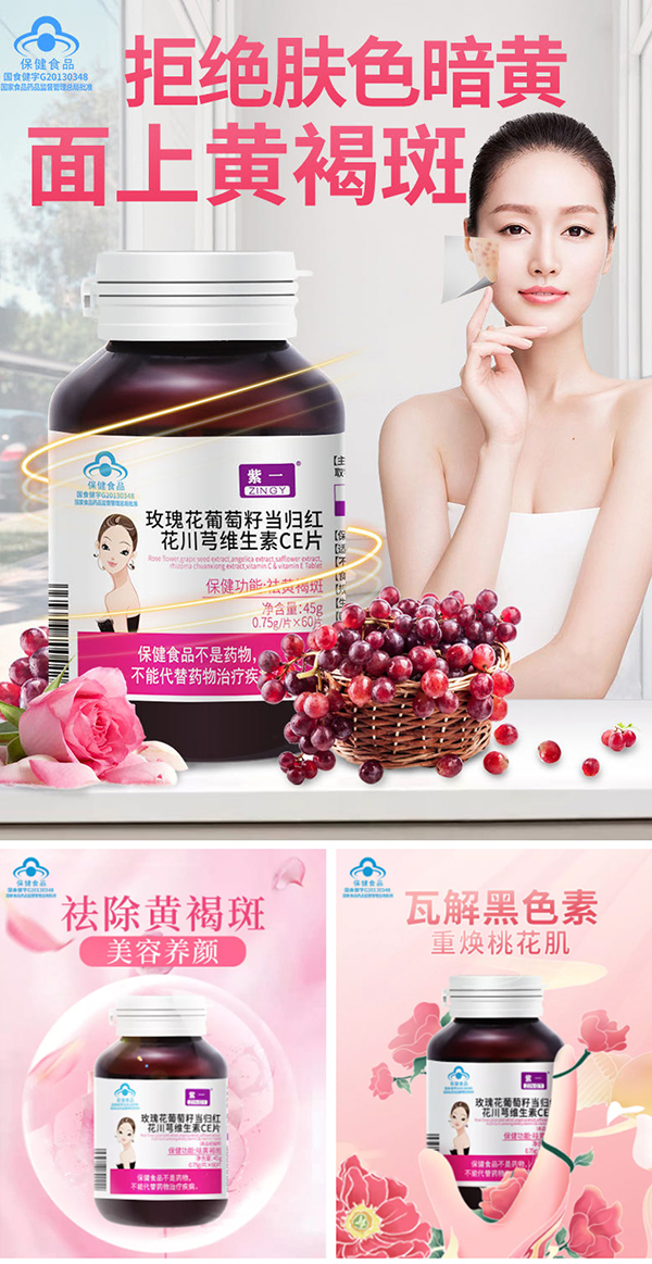 2.紫一玫瑰花葡萄籽当归红花川芎维生素CE片