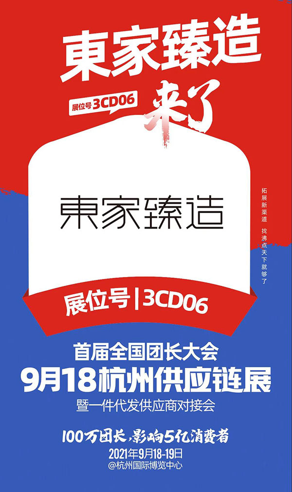 由沸点天下举办的2021杭州首届全国团长大会暨一件代供应商对接会将于9月18日在杭州国际博览中心举办。届时,普宁市吉子贸易有限公司旗下品牌东家臻造即将亮相本次展会。