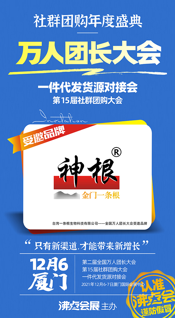 12月6号,第2届全国万人团长大会将于厦门举办,本次活动由沸点天下创办,由沸点会展主办,社群团购平台,各大工具平台头部团长聚集,展位面积20000平,展商数量500+,新品爆品10000+,渠道方1000+,行业观众10000+,是社群渠道的年度盛典。届时,台湾一条根生物科技有限公司受邀参展,届时欢迎您莅临B3X01展位参加!