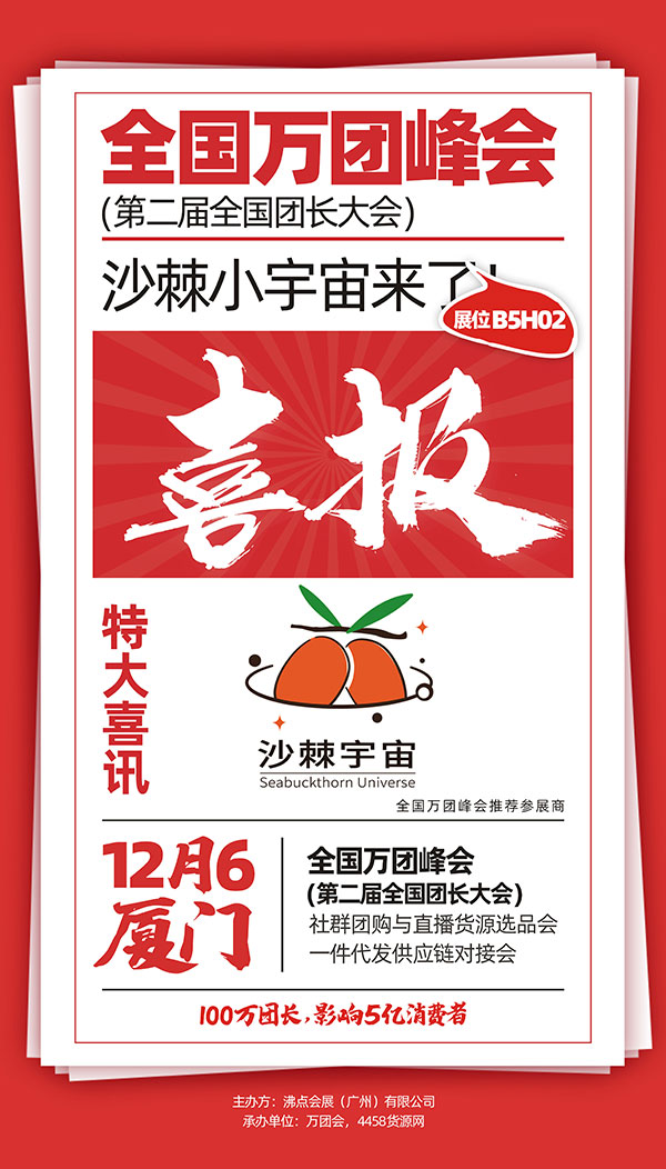 12月6号,第2届全国万人团长大会在厦门举办,本次活动由沸点天下创办,由沸点会展主办,社群团购平台,各大工具平台头部团长聚集,是社群渠道的年度盛典。如此盛典,成都沙棘小宇宙商贸有限公司受邀参展,届时欢迎您莅临B5H02展位参加!